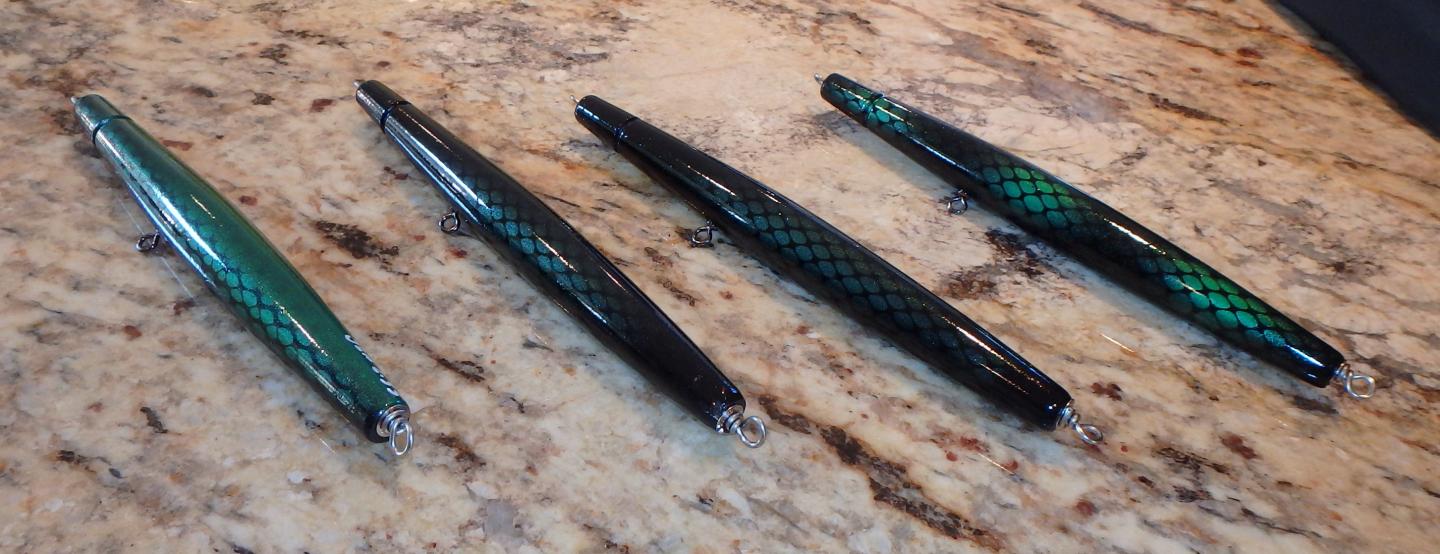 This season I committed to doing a little twist on plug building. I turned walnut, ash, maple and birch in a pike design and mounted on a stand to be a dest top pen holder. I made a few in segment pieces of maple and walnut glue together. Finished them and had a thought to do a super size Billy D stubby. 8" 3-4oz. swam it b/4 the harbor iced. runs shallow to mid depth. Did a bunch of offset turning on a popular diver. 6"-1/2 pike lip. Did a bunch of Noris Jet squids and Billy D stubbys.Finished off with a special order of Giant Plikes. Now they just need painting, epoxy and wire.
