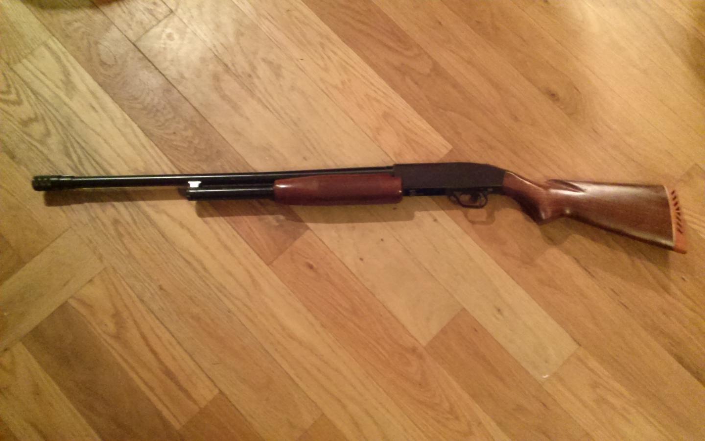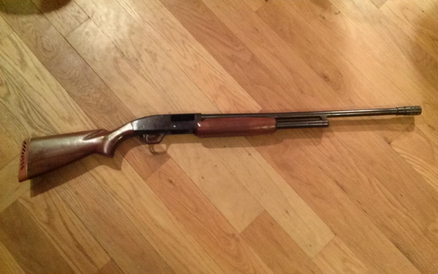 Mossberg 500 with an accu choke. Stock is walnut in very good condition. The bluing is in good shape as well. The action slides as it should and it shoots fine. I think its a 26 inch barrel length. $225