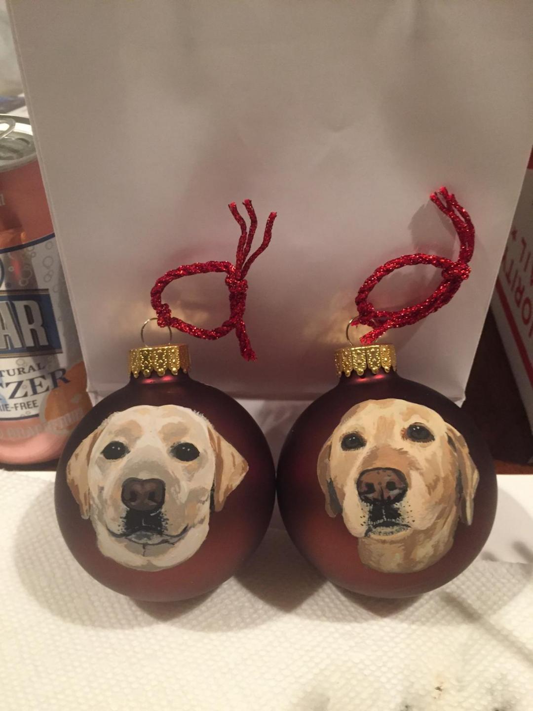 So between some shifts at a local restaurant, she has been busy painting ornaments from photos of children, pets and boats. She is my daughter, but I am impressed with her work. Here is a shot of two done of my brother's dogs. and she nailed them.
