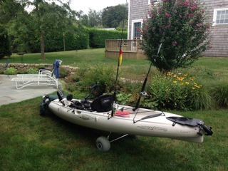2008 Hobie Revolution Fish Kayak, Mirage pedal drive with New Turbo Fins, V2 Drive, Larger Sailing Rudder, Old style seat (Not Vantage), Humminbird 383c GPS/Fisherfinder, Scotty adjustable rod holder and recessed mount on right side, Removable Livewell with submersible SW pump) (lashes in with shock cord behind seat), Battery in Sealed battery box with 115V recharger, Rod holder , Hobie paddle, Dolly shown in picture NOT included. Kayak has great striper fishing mojo... several 40 to 45 inch stripers caught from this yak