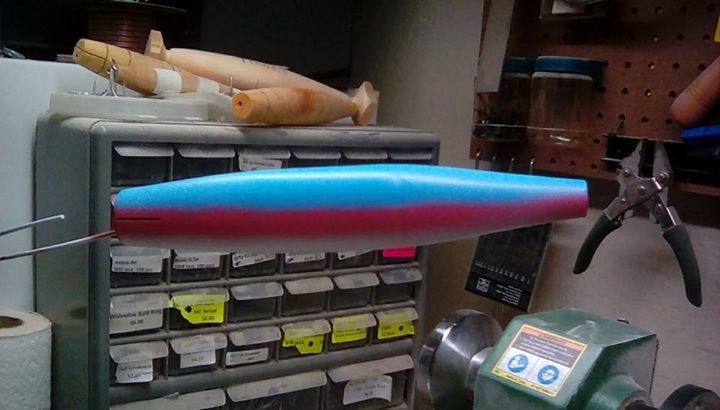Just started on some skonrads (skinny conrads). I and a few friends fished them last season with good results and since my lathe was still setup from them from spring I figured I might as well start the 2018 building season turning a few more. They are 8.5" long and finish at around 4oz. They barely float and get down pretty deep (8+ft) on a slow retrieve. Nice slow swimming action kind of like an eel coming through the water.