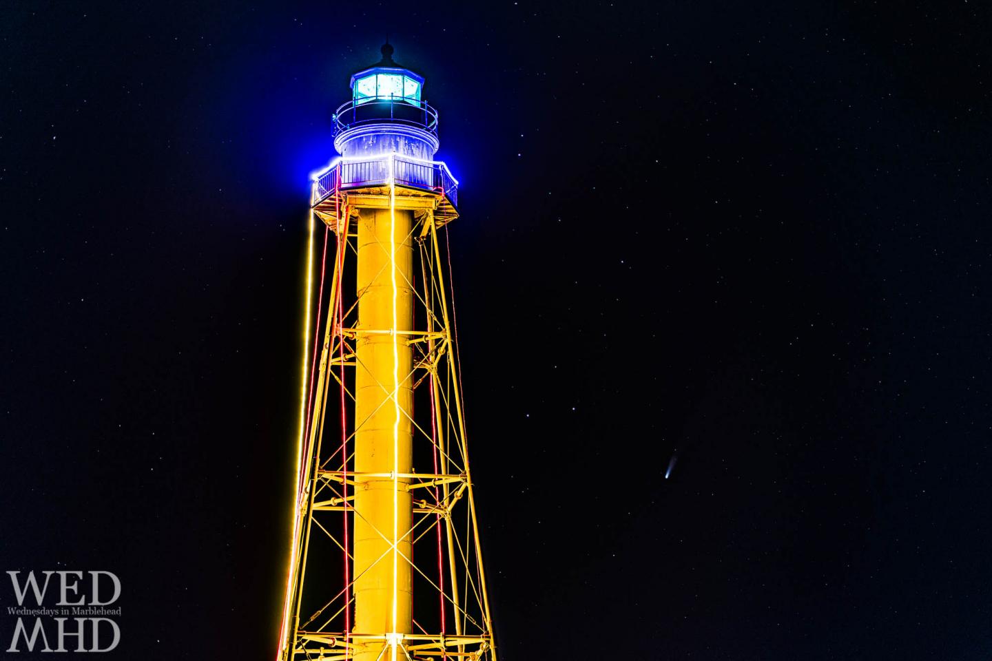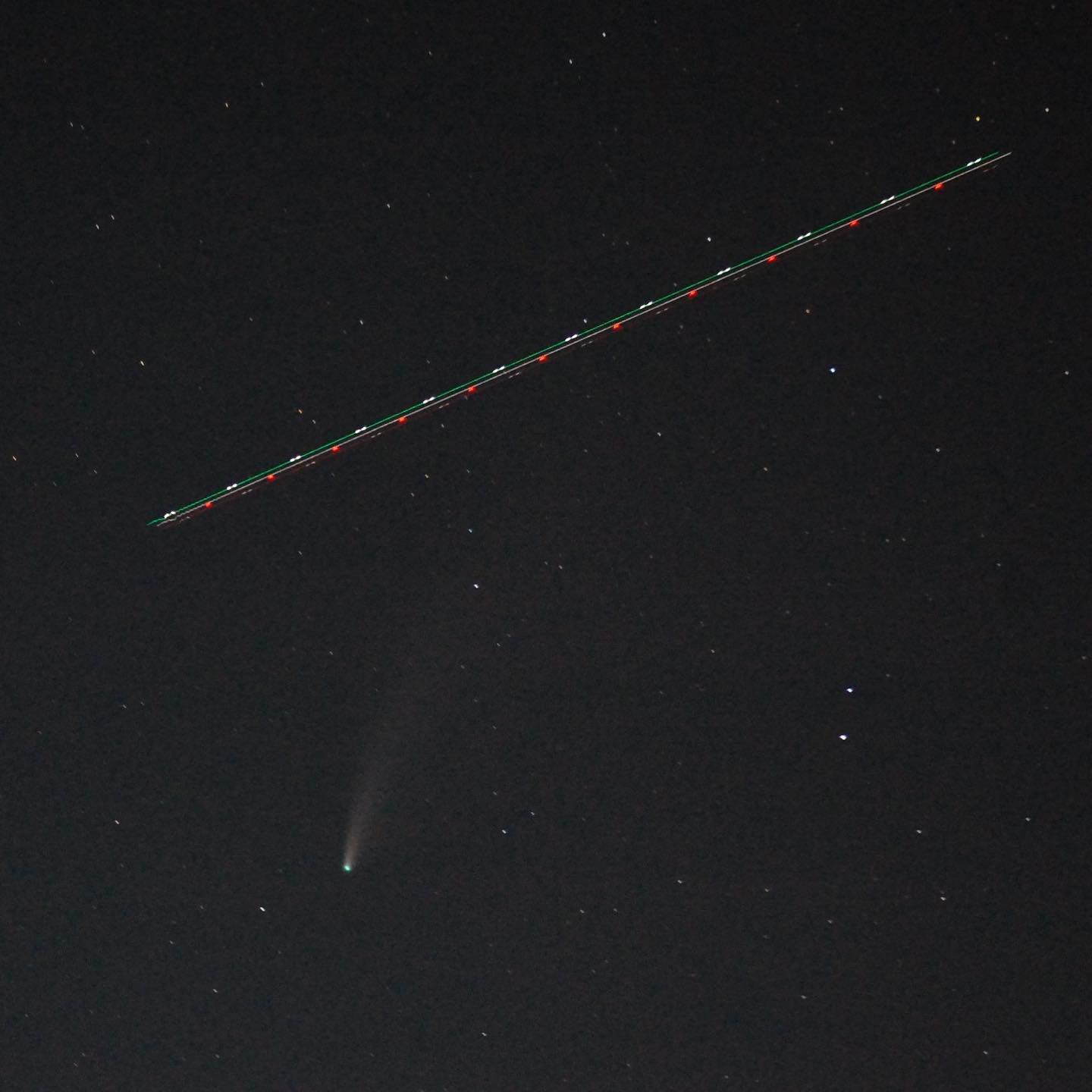 My cousin is a meteorologist and took this they other night, thats a plane with a red flashing light going by at the same time as the comet. 8 second exposure.