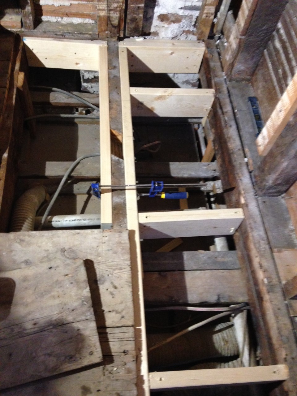 1800s house, new bath second floor, blocked off area to opened up floor for weekend, Monday morn kid says, mr. c look up...