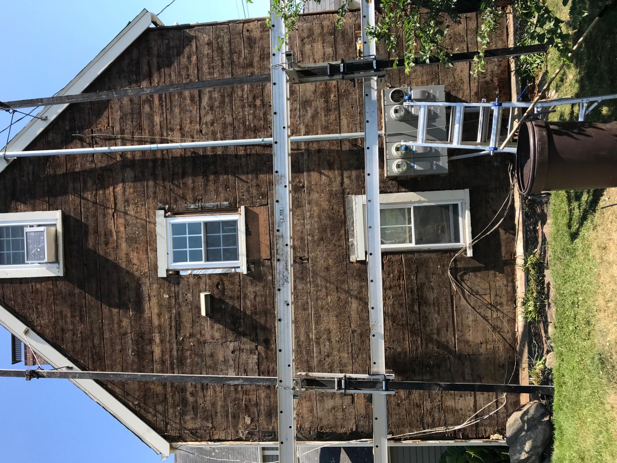 We started removing some very tired shingles today from the gabled end of a local house that was built in 1694. The boys got it halfway stripped and have uncovered original sheathing that so far measures as large as 20.5 inches wide and runs the entire 17' length! And it is solid! I will get better pics tomorrow as today's have a couple rear ends in the way.