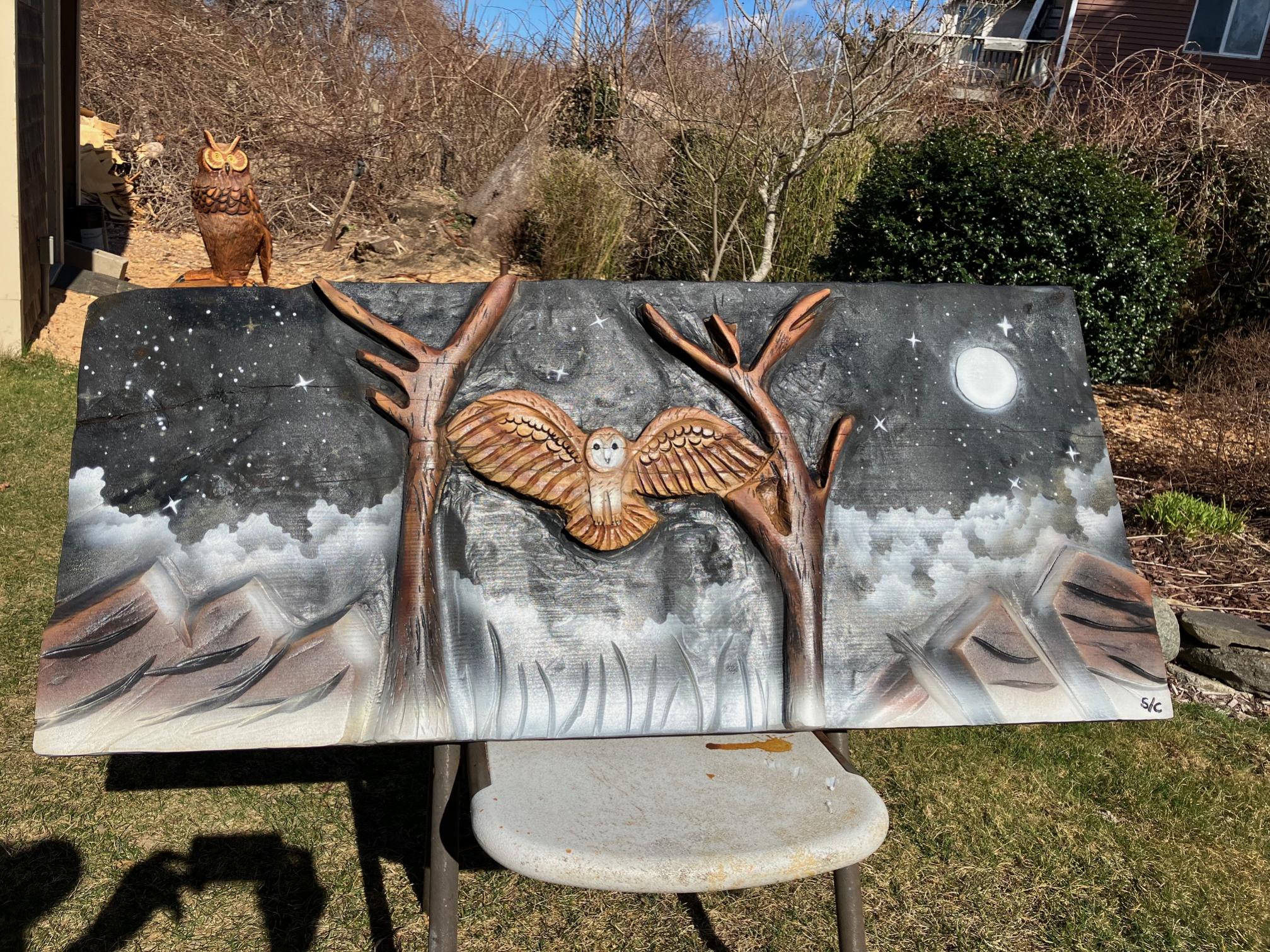 This one is ready, came out really sweet, first real in depth airbrush project. Sealed with one coat of timber oil and three coats of spar urethane, good indoor or outdoor wall hanger if anyone is interested. I'm still trying to figure out how to price it, dimensions are 47" x 22" x 2".