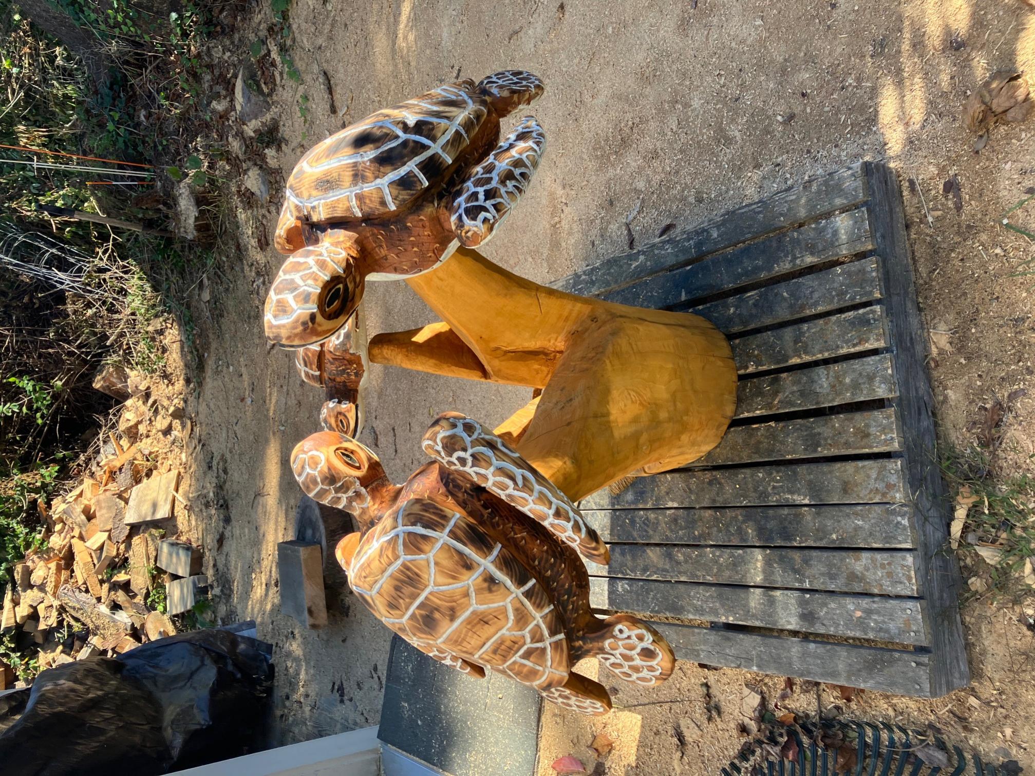 My turtles needed some rework, anything I did with a previous (bad advice from another carver) mix of helmsman spar urethane, mineral spirits and boiled linseed oil turns to dark after a couple years. Some sanding and a decision to use some Cabot white stain for the underside and top highlights, followed with some burning and clear timber oil brought them alive.