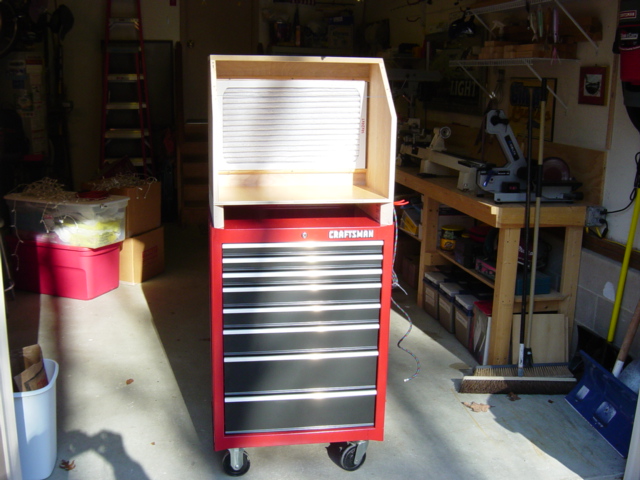 I placed the spray booth on a Craftsman tool cabinet. This allows me to move it out of the way when it is not being used.