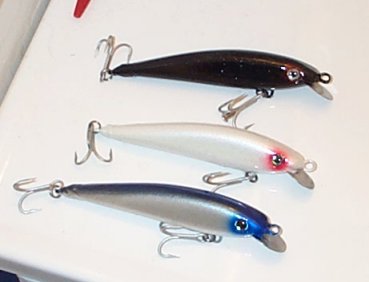 Striper sized cranks. 1 oz, subsurface, around 3-4 feet and a tight wiggle. The pearl ones are around 1 1/4 oz and dive around 6-8 feet.