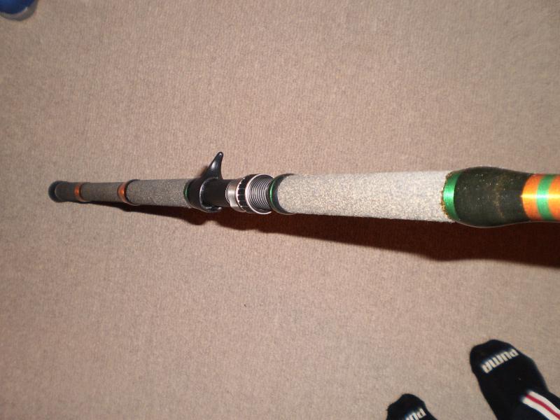 Not sure what model blank this was built on... It is wrapped conventional with a trigger finger and Pac-Bay guides. Kept it in very nice condition. Used it mainly as a smaller chunking rod, but for the open beaches I normally fish, I just needed something a little longer. Makes for an awesome jetty rod... or if you just like smaller heavers from plugs and such. Can email better pics if interested. My brother measured the length from the butt to the reel seat and said it was between 25"-26". I'm not sure if he measured right to the middle or what....
