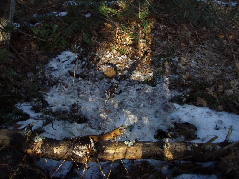 This past weekend in Maine I went off the trail on my snowmobile because I was looking at the same type of scrapes. Also the Maine ones were made where there were other Moose Sign. That would be a bonus finding a Moose Rack in Ma. Beware of ticks. Hiked 3 miles on some powerlines yesterday and the wife and I each had to flick off close to 50 ticks apiece. Also found 3 large piles of hair but no carcass. Looks like coyotes got one or found a winter kill.