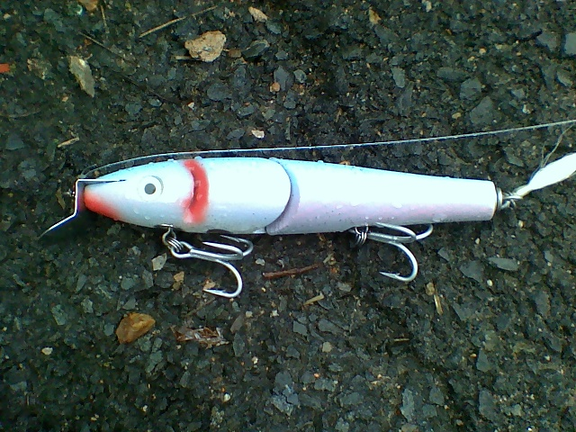 Larry Sweet water shots. I saw them at Plugfest, dynomite. I've been working on a jointed version simalar to yours. The cut is in reverse. I got the joint tight by countersinking the tail and front section then sending the premade loop up toward the nose w/wire doubled over like the old jointed Creek Chub giants then opening uo the closed loop with an awl at the lip side.Clip the tail wire premade loop to front section then twist the rear tail loop like normal. I'll swim it tomorrow. I'll get a picture out shortly.