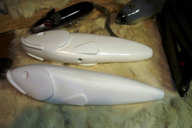 The FIRST Trout I did was the BIG one I sent JOE.-->Rockfish9, then I try improving them an that was the ones I SWAPED at last years PLUG FEST. an this is my 3rd try at giving it a realistic apperance. Im doing a STRIPER ---> but cant seem to FIGURE out how to PAINT it w/ rattle cans an get thoes LINES or marks in scales effect   Ill bring them to PLUG FEST maby some one can PAINT IT w/AIR BRUSH, an Ill give them one in trade.  hers a pic of the 2. of them one is PRIMED an the outher already has a white base coat.