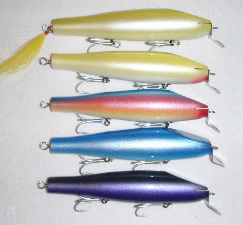 The first picture are modified cowboys. They are based on the old run of cowboys which in my opinion are a far superior plug than his more recent run. I trimmed some of the fat out of the back of the plug to reduce the rear buoyancy. This helps the plug get deep and swim much more level in the water particularly with a rear flag in place of a treble hook.