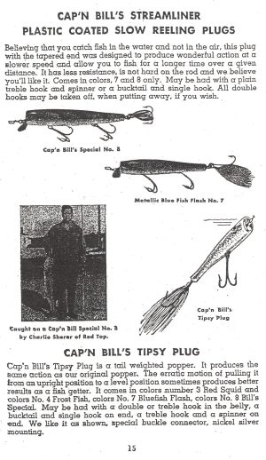 The article in the Collectibles mag says the Capt Bills plug catalogs were great reads with great images and descriptions of their plug line. It would be fun to see one of these old plug catalogs from the 1950s.