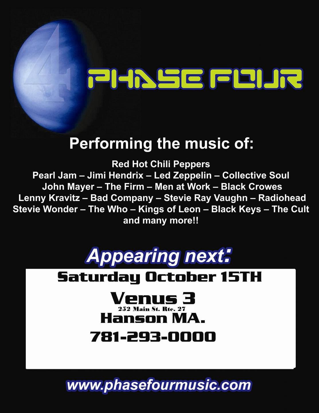 Hey Bart, we're called Phase Four. I attached a flyer in the first post with the venue info. Here's a link to youtube that has a bunch of video on it. Thanks for your interest and if you ever want to get to a show give me a heads up and I'll buy you a beer!