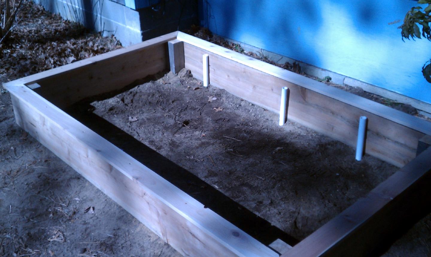 well here it is, a few designs changes later, and about $50 worth of cedar I am pretty happy with the results. Corner posts have 12" of 4x4 underground The pipes to are not fastened in yet so the spacing is off, but wanted to see how it would lay out. Thats a new twist to lock in some thin pvc pipe frame for a bird net and or maybe even a plastic cover for early plating.