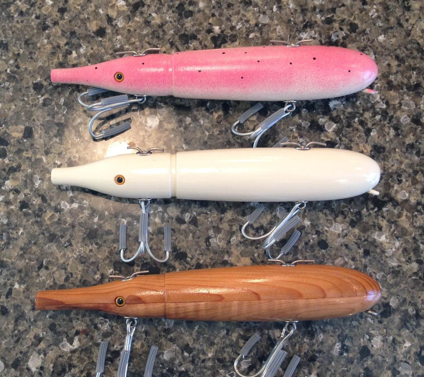 been busy working on several things this fall-winter. Not just plugs. Here is where I am at this point. Got 4 vises pretty much done. Still have to machine the jaw holder but need to figure out which size I am going to put in so that part is un done. This has taken most of my spare time since last year but I want a new rod or 2. Then I got a cypress striper with ayc fins to maybe hang on the wall down the cape or a weather vane. Still got to figure out the finish and such. Probably end up looking like this next fall too. Only so many hours in a day. Then plug wise I got 1 jointed darter done for a promise. a couple tiger maple Bass Aquas for a promise. For me I have some needles of various sizes. Some I already make and a few new ones. Some top water stuff , canal and a Gibbs copy. Darters. A Pichney jointed so I can give VB back his original. A large and small Pichney Danny and a med. BM Danny copy. AS you can see I got lots to do before I get them done and this weekend has been all snow removal