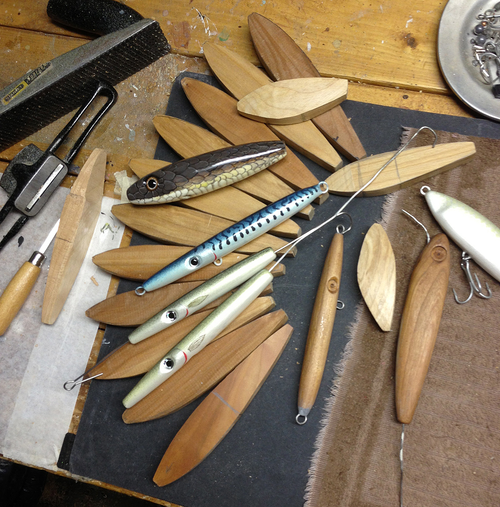 Seems like I have had less time this year for building but am getting some stuff done or at least in the works. Hopefully done for Plug Fest. I have some needles done already, (more than in this pic) some small peanuts and stuff in the works as well as a bunch of sinking glider/jerkbait type plugs. All the rough blanks and un-primed stuff in the pic is cherry. The painted needles are mahogany, and the spook I painted like a snake it cedar. That was a fun one to paint. That one may not see the water but the rest will.
