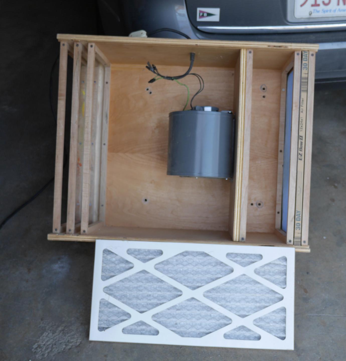 I have recently installed a dust system and exhaust fan in my woodshop so I no longer need this ceiling or wall mounted Shop Filter. This air filter removes airborne dust from your 250 sq foot shop in about 5 minutes. It uses a squirrel cage blower and 3 pleated furnace filters to effectively remove dust that would get into your lungs.