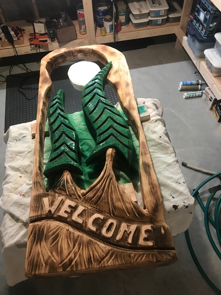 Finished up Mickey its available if you have a small child who is a disney fan, it's polar 14x9". The welcome plank carving is almost ready, once the green sets, I will be adding some snow on some of the branches and it too will be ready after a couple coats of sealer. I'm pretty happy with that one, it's 3" thick about 24" wide and 4 foot tall, PM me if interested.