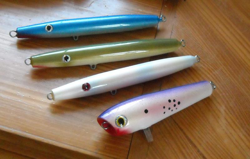 Here's a few needles that were leftover from needlefish month, there was a real nice black &silver one that got dropped, and that lone popper was part of an experiment from earlier in the year. I think the belly hook is too far forward on it but we'll see.