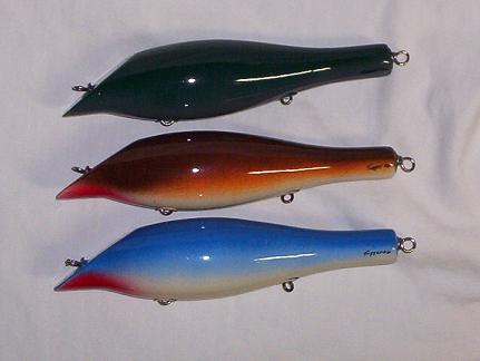 Test swam the white one yesterday .. Sat in the salt pretty much identical to the fresh water I been tanking them in .. Cast very well,,no helicopter,, right out there, It just sat on top tip of beak to 2" back from arse,, Round mound of top of the plug sitting high and dry very visible.. I gave it a good tug and started slow retrieve and it was gone.. Didn't make eye contact again with it until it was close and it was making its way back and forth slowly and randomly,, I was amazed at how slow I could retrieve this massive piece of wood.. I thought any slow down in retrieve and this plug was going to come to the surface like a cork . It didn't in fact it stayed down and did little swimmer like wiggles on very slow retrieve,, reel a little faster and it would start to sweep .. I would say retrieve on this plug should be varied all the way in . The plug stayed level also ,, did not dig down banging off the bottom but stayed very close to the bottom .. I tested off a beach so maybe it will bang the bottom in heavy current .. Very bottle darter like .. now to see how it catches .. Should be good ,,late fall , about 2 am., Only modification ,,,might be a good idea,, brought to my attention by Tobias is to delete "belly arse" hook and go with 2 hooks .. Andy says he's done it with no ill effects to plug action .. I still went with the 3 so it could be an option , I'd like to try two 4/0 or even 5/0 hooks on this plug .. think the wood can handle it .. all done with this... on to Lil Nike ,, I hope ..