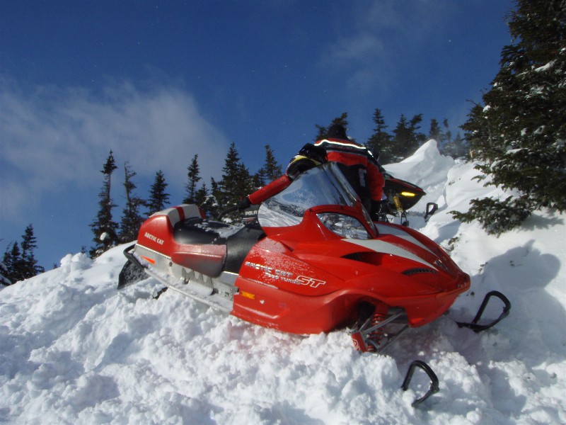 Well got back yesterday and the pics speak for themselves. Drove up with no sleep after work Friday. Got to Jackman at 6am and it was pouring. Gassed up with 100 bucks for the sleds and trucks and sat in the rain pondering why. Just as we were going to take a nap I heard the tell tale signs of sleet. All of a sudden it turned to snow and for the rest of the day it snowes. A few minor areas of drizzle but all in all we got about 3 inches of snow. First 2 are one of many moose we saw that wouldn't leave the trail. The 2nd is the border cut with Quebec. Still 4-5 ft of snow off trail. Hardly saw any dirt or rocks. Snow is really soft and wet in the afternoon.