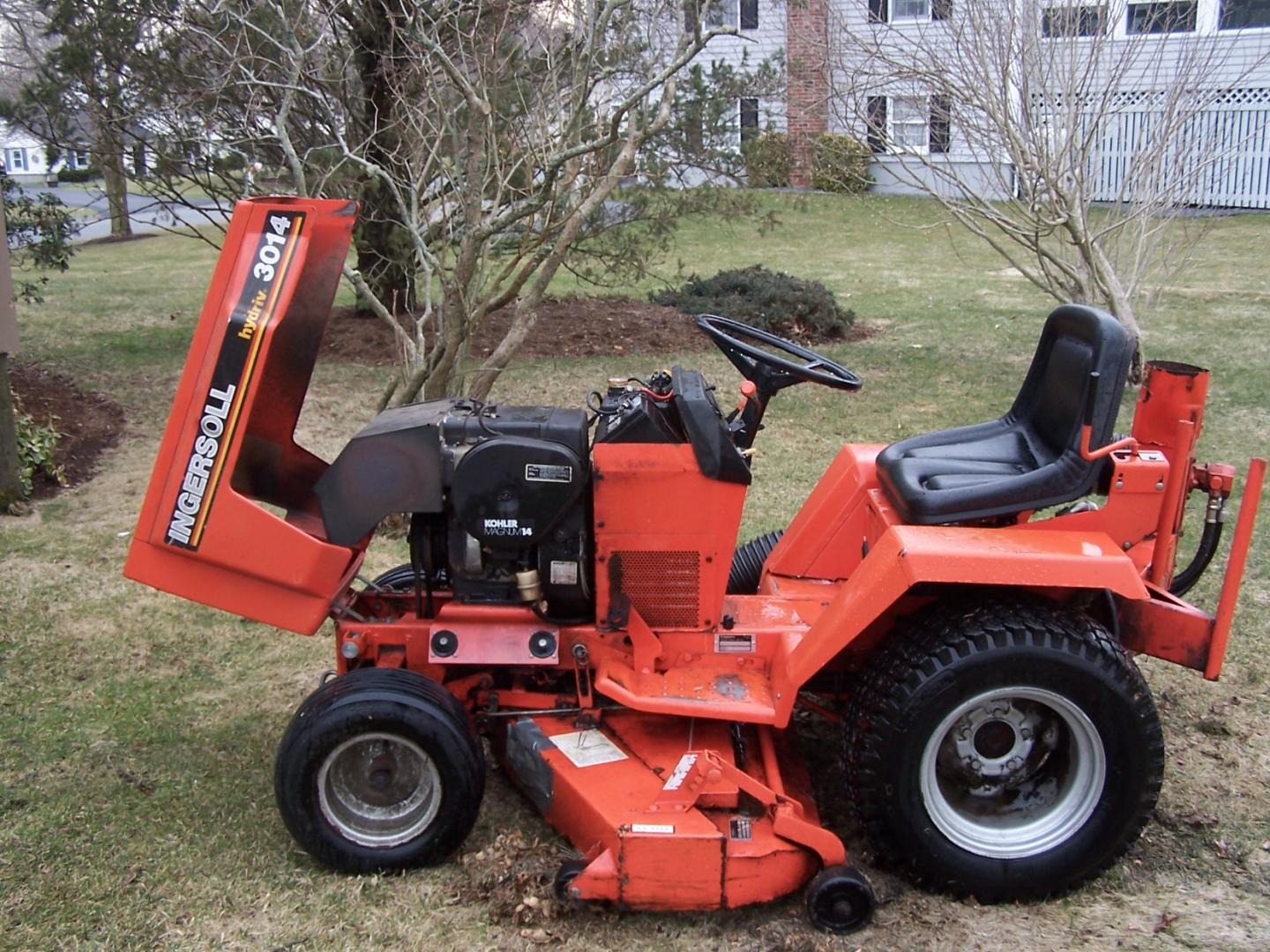 I have upgraded to a new lawn tractor and was going to keep the Ingersol to use just for splitting wood. It has a commercial grade splitter that bolts to the back of the tractor that retailed for $1200.00 when we bought the lawn tractor itself. Now I'm sure it would be substantially more for the same setup. We had cut a deal for the lawn tractor when the owner of the business says a guy bought a splitter from me and he can't handle it. Told me what it retailed for and said I'll sell it half price, so I took it. My wife says after my recent tuneup in the hospital to get my heart running on all eight cylinders I can no longer buy log length wood, cut it to length, and then split it. Aw gee willickers, your breakin my heart. Anyway this tractor has 1078 hours on it, but runs like a top. It has a 14 hp Kohler engine on it. I have replaced the carburator and the fuel pump. The battery is one year old. The neutral switch crapped out years ago so I have to lift up the hood and use a finger to pull up the switch contacts, and then turn the key to start the engine. The mowing deck has some rot, right behind the left front tire(see duck tape), which to the right person who can weld a patch on it wont matter. The seat is only a couple of years old and cost well over a hundred dollars to replace. Everything is hydraulic on the tractor. The mowing deck goes up and down by hydraulics, the grass vacuum works on hydraulics, which bring me to the the most obvious blem on the tractor. That housing for the hydraulic suction/vacuum rotted. It can be replaced, but I am not doing it. I bolted it together better and it works fine, but in a perfect world it could be replaced. I am selling this first and foremost as a splitter. The splitter never met a log it couldn't handle. All the hoses are new and there are no leaks anywhere on the tractor. Every third or forth time using it I have to add about and 1/8" of oil to bring it to full on the dipstick. Oil was changed every 25 hours as called for over the years, and thats why it still runs as it should. I have a bunch of pictures I am going to post with this ad. I am asking $650.00 for the tractor. It cost almost $5000.00 twenty years ago.