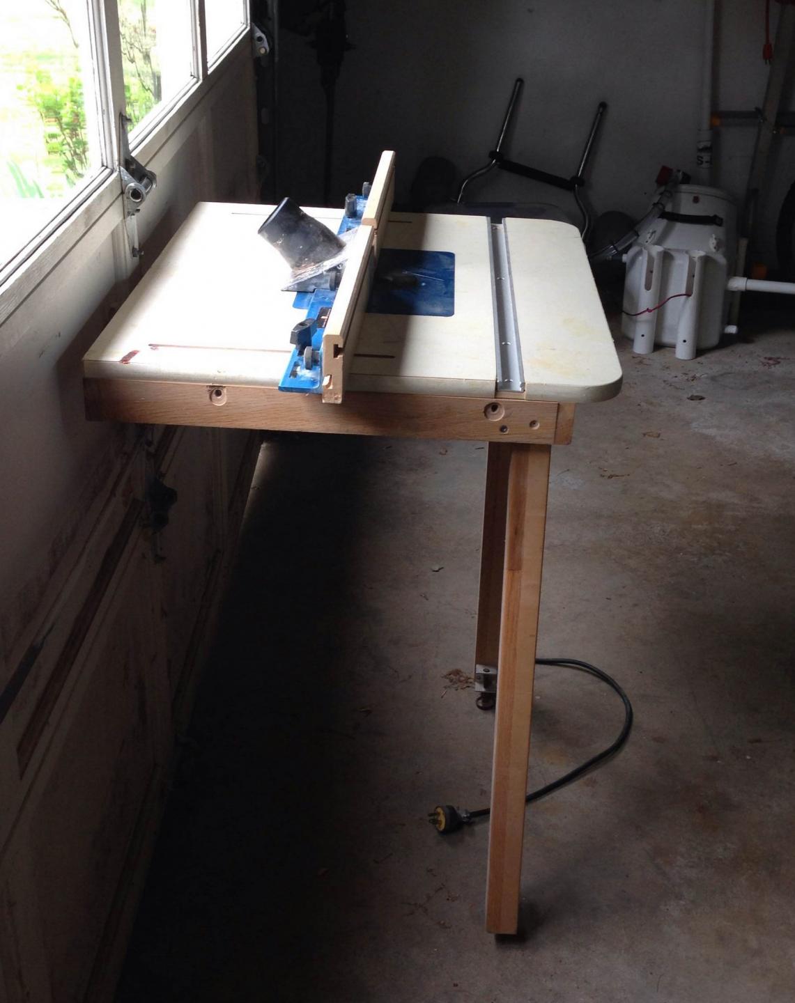I used this as an extension to my Unisaw and attached it with clamps/short boards each time I used it. It has shop made legs with leveling casters at bottom of each leg.