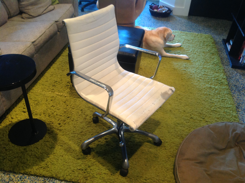 Small scale Eames style in white leather. It was 350 or something new but cosmetically it didn't hold up well. Heavy for its size. Mechanically it's fine and it's comfortable. Would make a good shop chair or something for the garage.