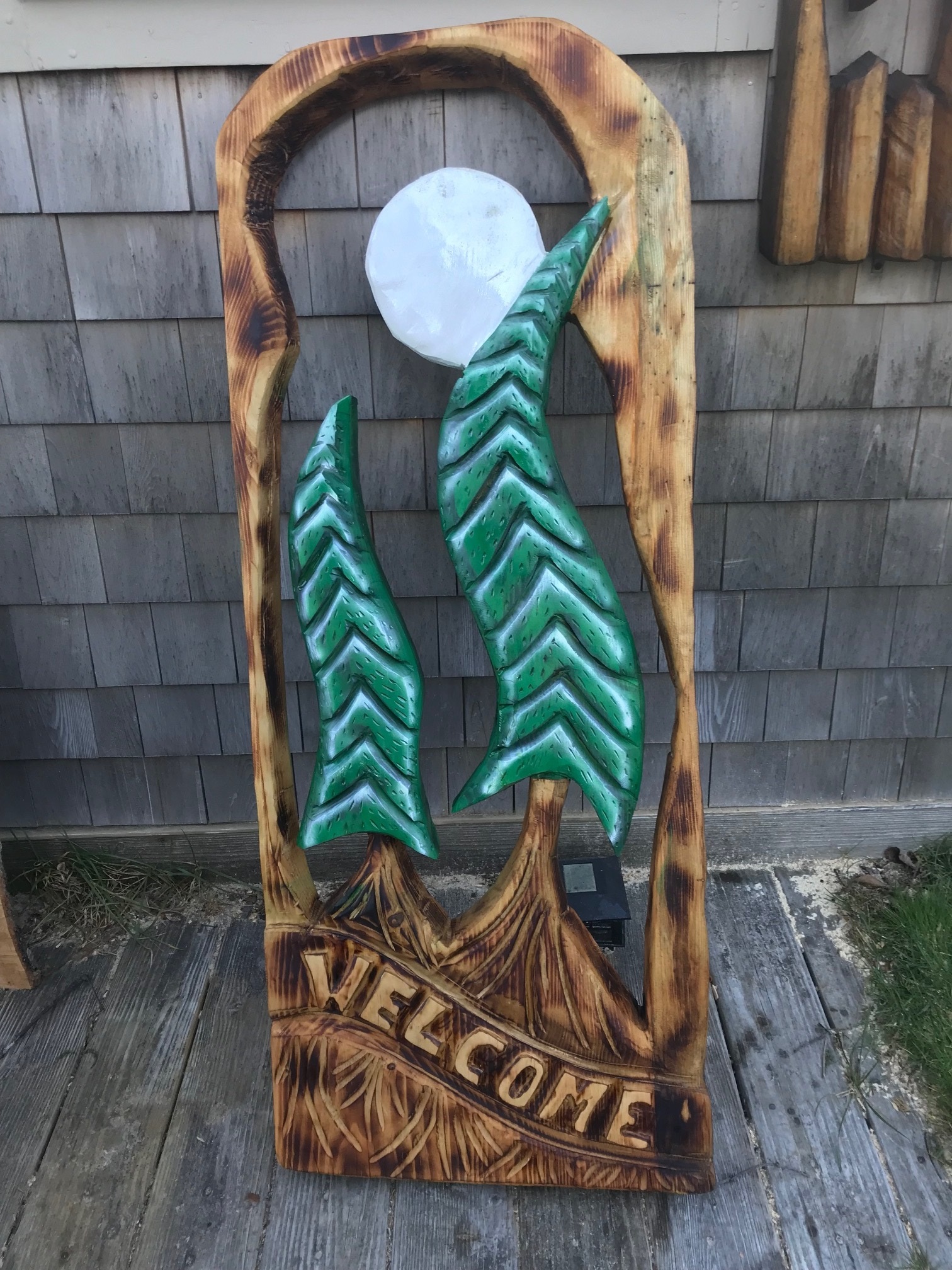 Crane is $200, welcome carving $225, pick up in Plymouth ma. Chainsaw carvings in white pine, sealed for outdoor use. Both approximately 4' tall, 24" wide by 3" thick.