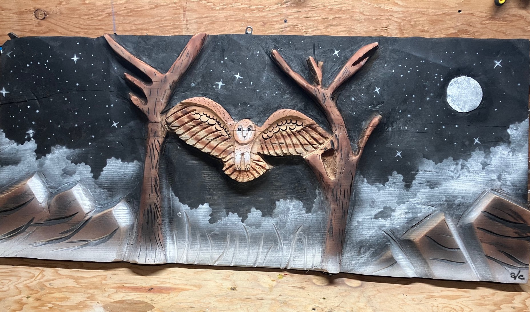 Finally following around with some airbrush painting on a relief carving and I'm very happy with the way this came out. Done a little experimenting with the airbrush, but not on this scale. Need a stretch of 50+ degree days to get it outside so I can get some timber oil on it to seal it, pm me if you think you have some interest.