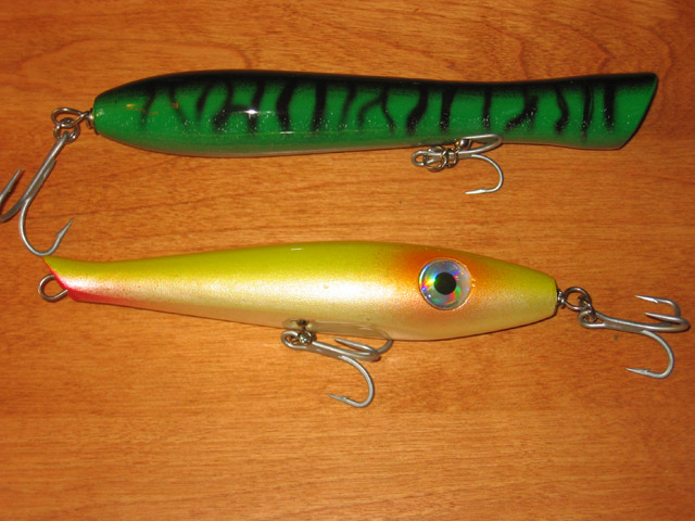 A mackeral pattern giant yozuri type pencil weighs 4.6 ounces, 5/0 treble in rear, 4/0 on belly. ayc , 2 coats of clearcoat scuffed then 2 coats of envirotex.