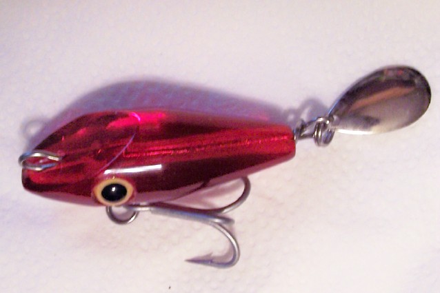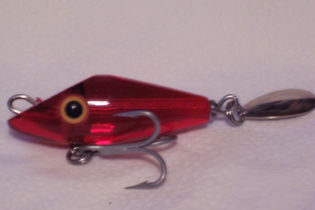 Here is a little ruby red solid acrylic darter that is 2 1/4" long with a 1/0 VMC treble and indiana blade.