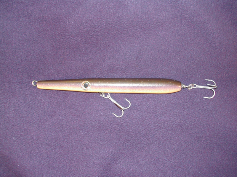 Last spring #^^^^^^^^^^^& gave me a few blown out needle bodies to play with.... I filled themisaligned thru drill holes, and redrilled them. Some still ended up in then firewood bin.... This one was a complete success. Fisihing one of my favorite rips up here. Tossed the guy out quartering upstream and let it swing like I would a wet fly if I had been fly fishing. As it came around and came up to the surface at the end of the swing, a 38" bass hammered it! I was so tickled, I retired the plug. I think it will go back in the water next spring :-)