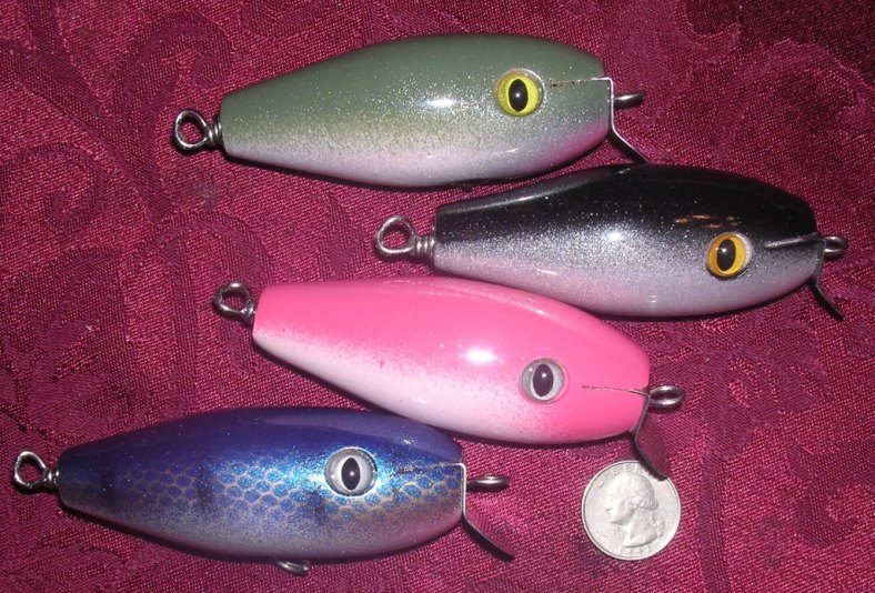 Here's a few new ones. Montaukmaniac made a sweet peanut in a swap on another board, inspired me to try a few. Just under 4 inches and barely over an ounce. They swim incredibly well, barely under the surface with a nice sexy wiggle. They will hopefully produce well on Long Island's North Shore and the good amount of peanuts we get here in the harbors.