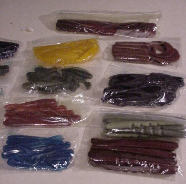 8 bags 4" little jerks (yellows, plum, smoke, limes and blues), 2 bags of 4" split tails (blue and root beer), 2 bags 4" shad (yellow and smoke), 2 bags of 6" half jerks (plum and olive), 1 plum bag of 5" split tails, 1 bag of root beer 8" grubs and 1 bag of root beer 7" split tails.
