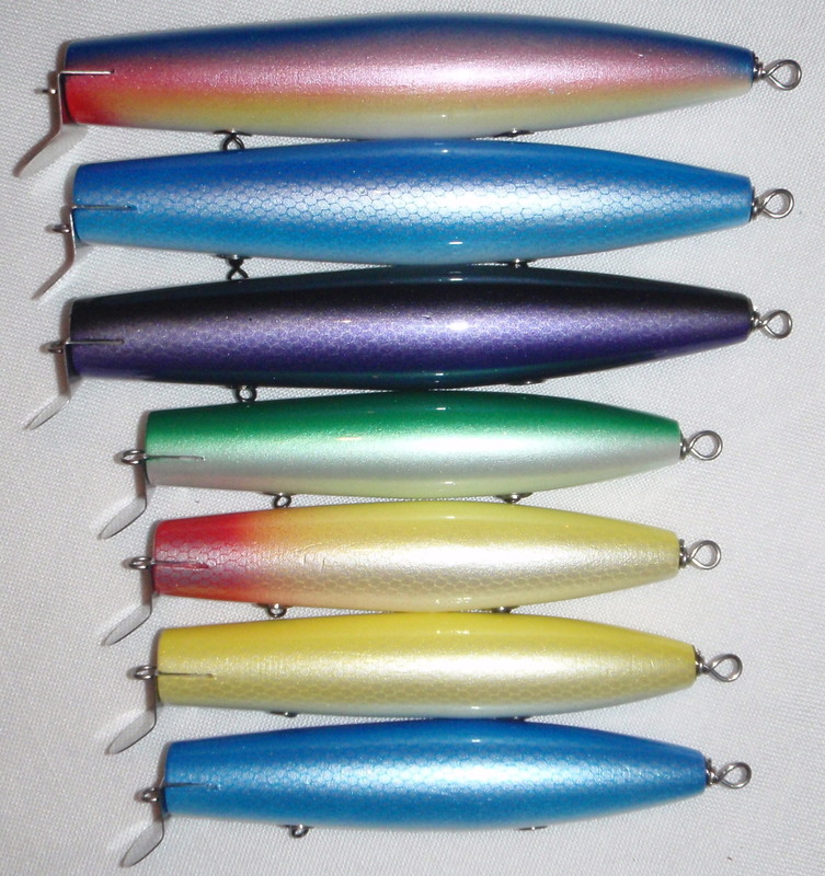 Just finished off a bunch of Musso Donnys. The first picture are Juniors- top is a maple 3oz, middle two are pines 2.5oz, and a surface swimmer 2.375oz. Second picture are Seniors, Top two are Pines 3.375oz and a surface swimmer 3.25oz. Finally, a family picture. All weights are rigged with 3 trebles. Some of the weights are a little off traditional Musso's so I'm curious to see how the perform.