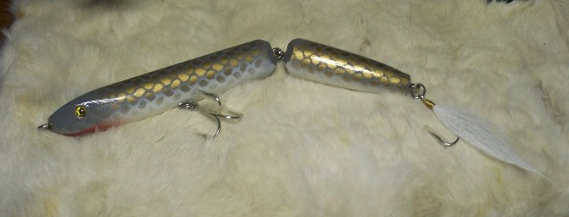 I liked the color of the Big EEL, so I did up a couple more in the same COLORS the first one is JOINTED SURFACE SWIMMER second is a PAW PAW BASS WOBBLER in eel colors, I did up a couple of them for a friend that freshwater fishers for pickerel so I kept one for myself an will give it a shot in salt.