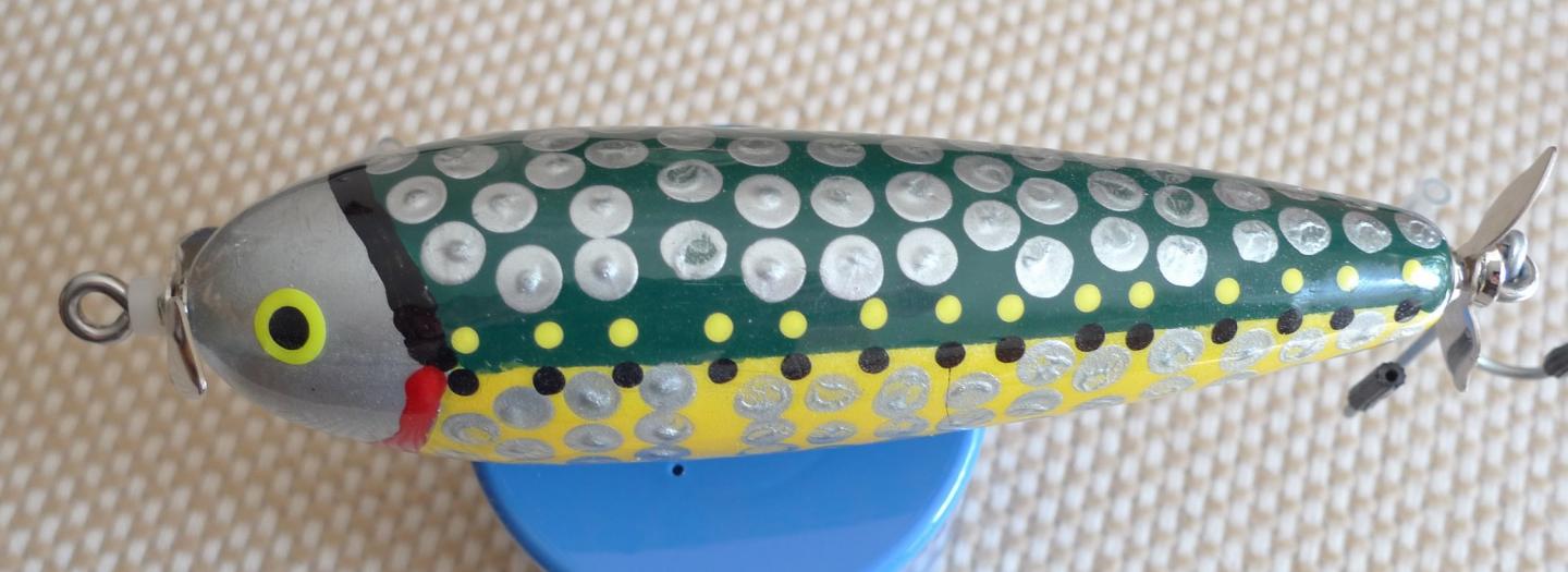 The up sized plug I made is 5.5 inches long (wood section) and weighs about 2.7 oz. It has a fore and aft spinning prop and is center weighted with one big belly wt. It is configured as a wounded minnow to swim one side down.