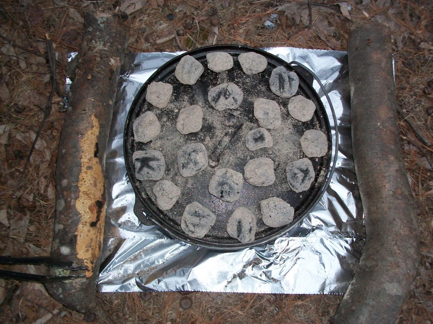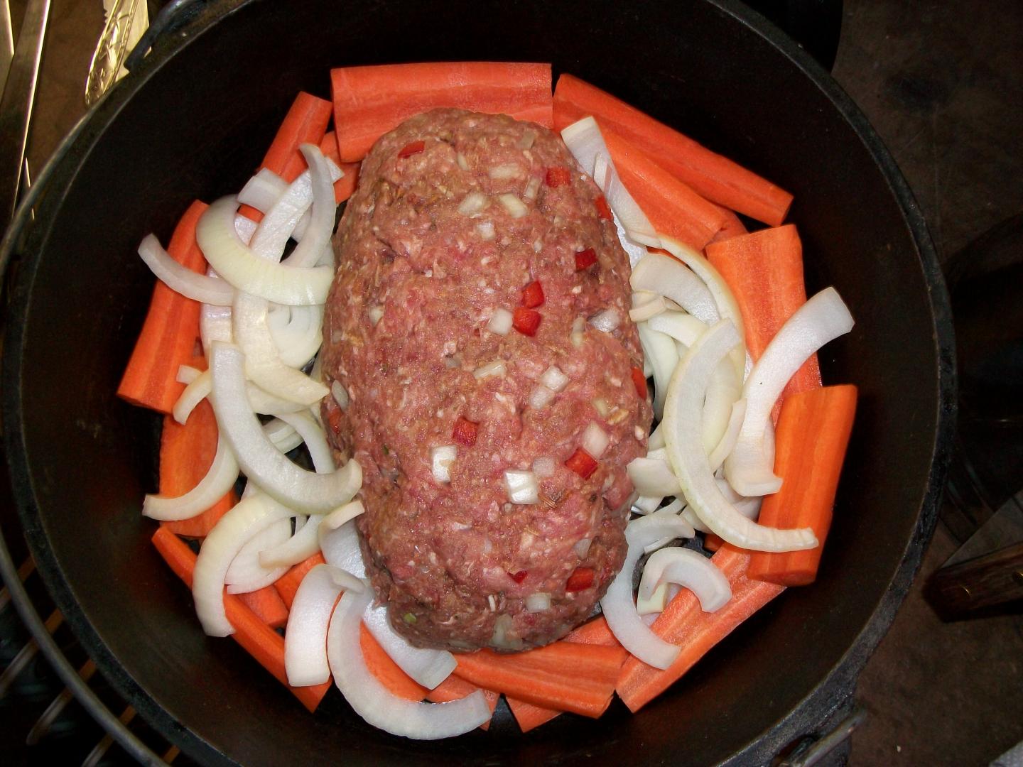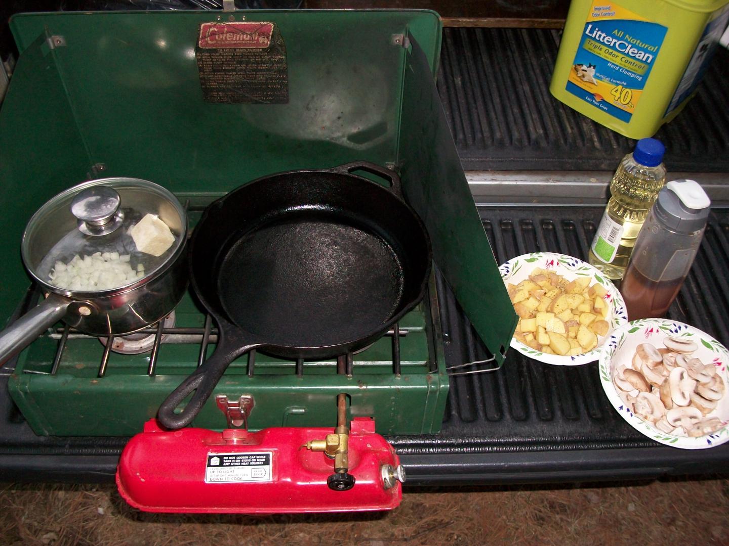 Fired up the meatloaf in a Dutch Oven w/ the Carrots and some onions. Prepped the Stove for the potatoes and the Gravy.