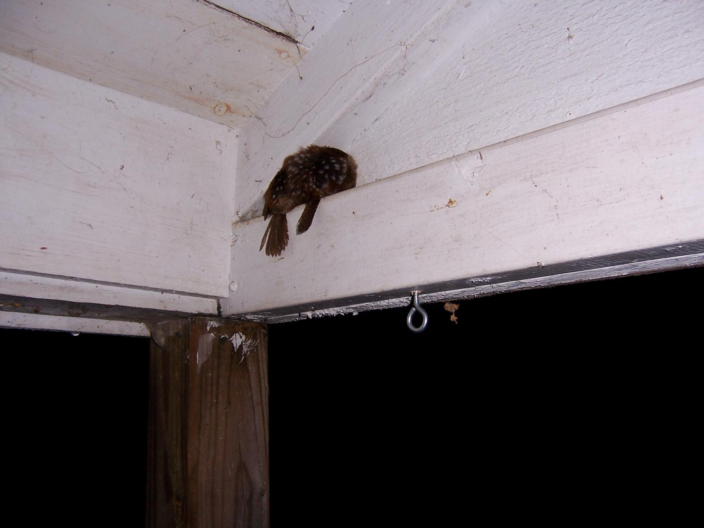Here are my pets, Carolina Wrens. They sleep there. Their heads are buried in their feathers and never even move no matter how close I get. I have not feed the birds this year but my compost pile has been like a bird feeder with tons of birds rooting thru the kitchen scraps all day long.