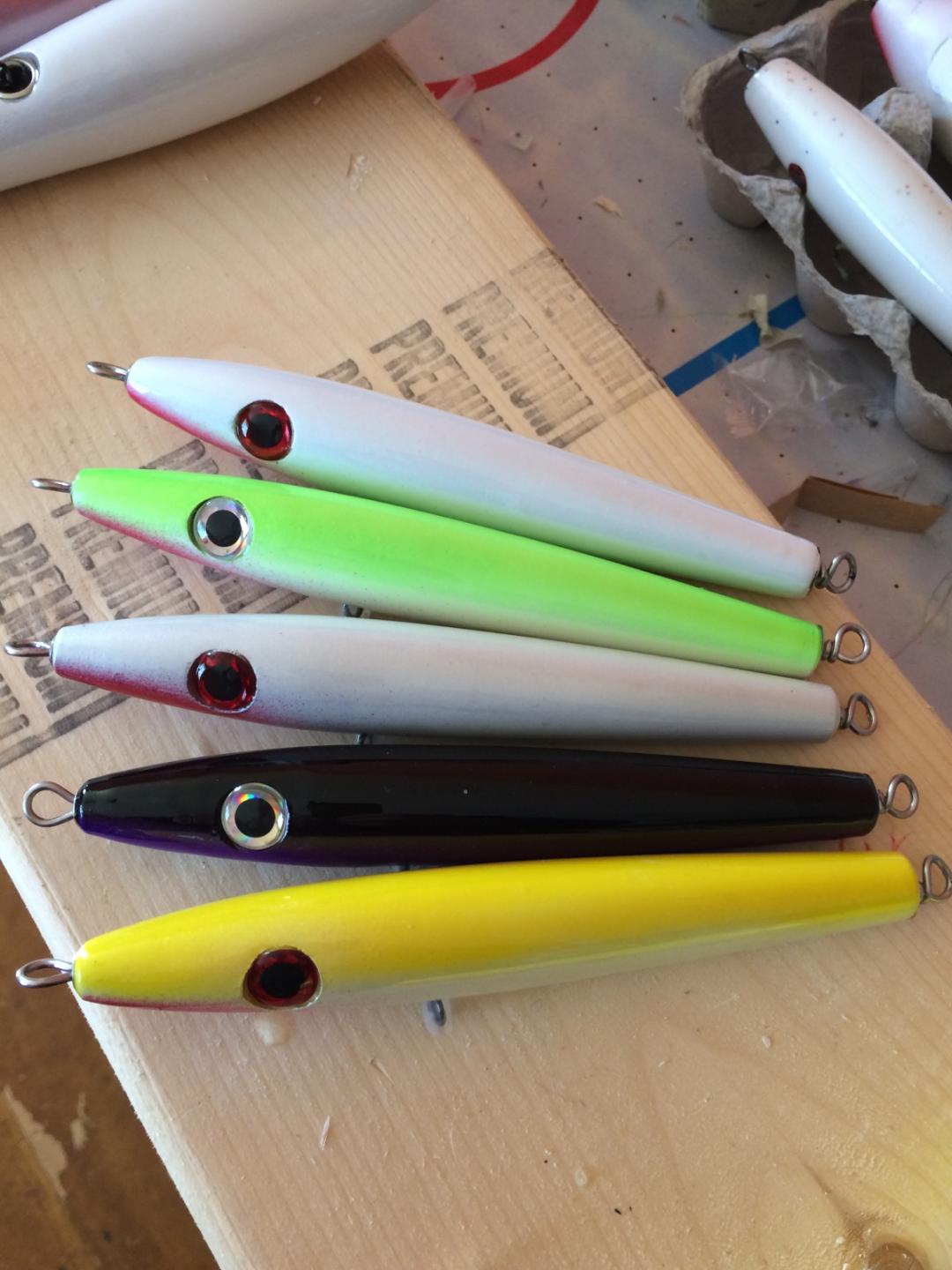 Last pic is a shorter/fatter proto type version of a needle I usually fish in the fall. I made 3 of these last year (top one is the original which I did well on and took apart and refinished. I made a few more to try in different colors. Those are around 2 1/4 oz.