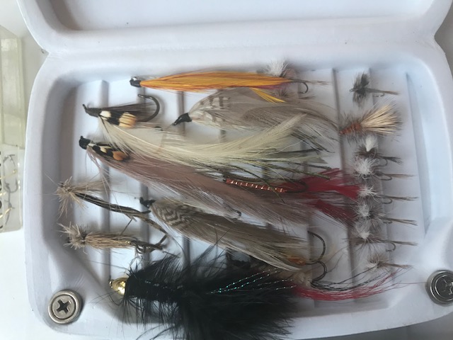 Her day was into heading to Maine to fly fish, so I will probably put these up for sale, now if I only had a clue what they are worth. Includes a couple orvis boxes, 12 dry flies, 11 streamers and packages of #10/#12 hooks.