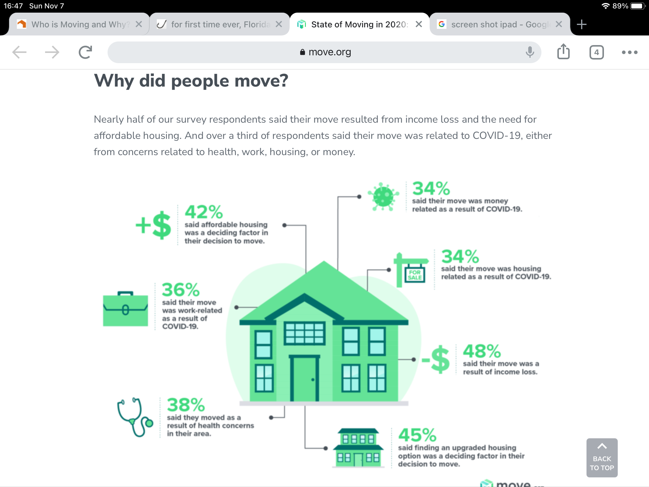 Since the COVID-19 pandemic is still unfolding, it is difficult to assess its possible impacts on mobility. It could be that mobility is going to spike after the quarantines end and people move to cheaper housing (if available) after losing income from a job loss. Mobility could also spike as a result of evictions or foreclosures if substantial payment assistance is not provided before the temporary bans on evictions and foreclosures end. It could also be that mobility will decline further as people become less likely to buy or sell homes, especially during the quarantines but also afterwards due to higher economic uncertainty. Working from home is likely at record high levels right now, and if even a small portion of this shift proves to be permanent, it could mean fewer people moving for job-related reasons as well.