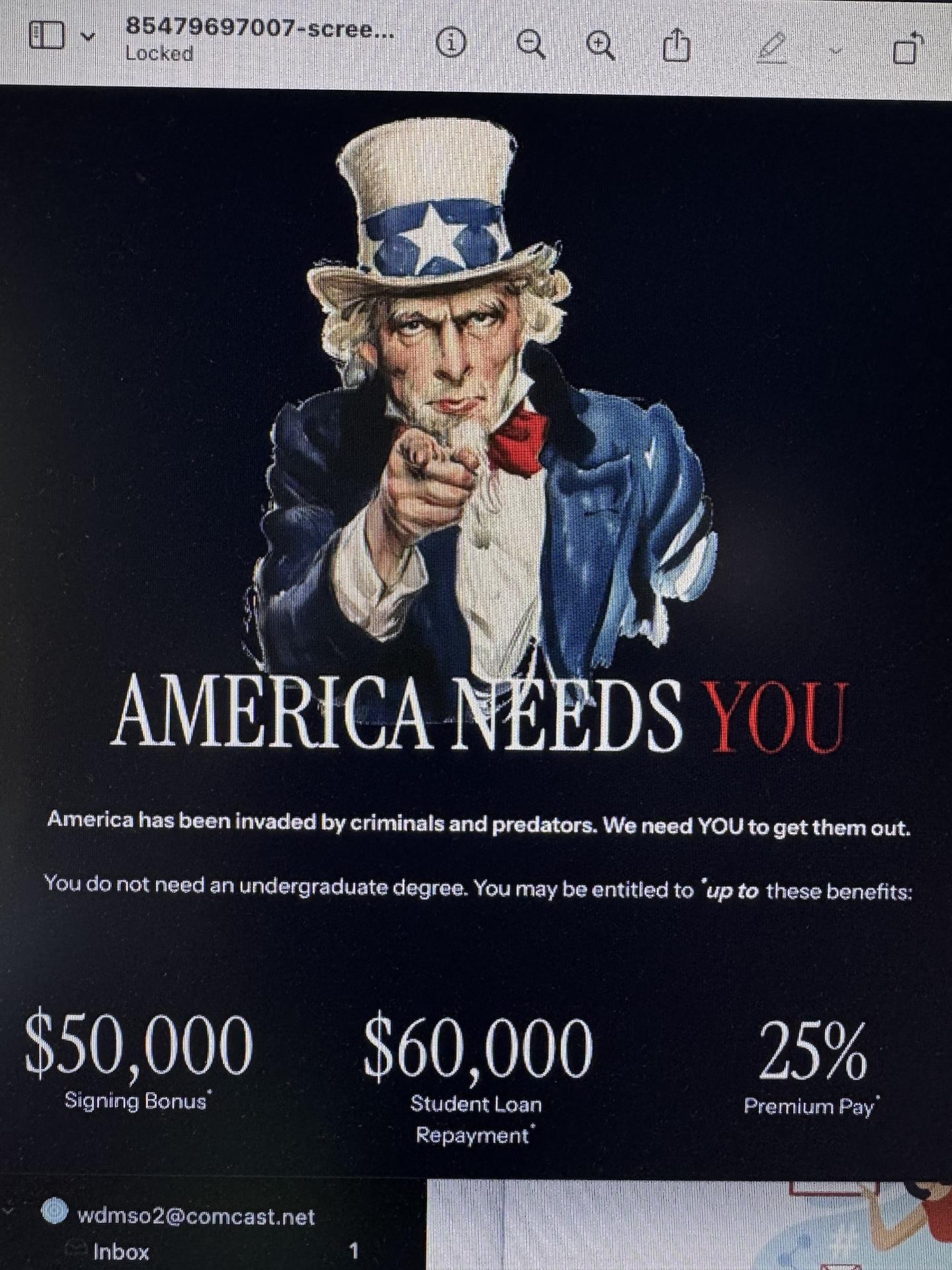 The recruitment Poster Takes the Cake. Using Uncle Sams iconic Image : America need You. America has been invaded By criminals and predators. We need you to Get them Out.
