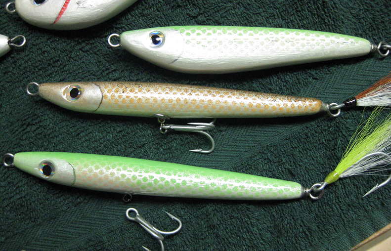 As for the weighting most of the plugs I have been making are slider/glider type plugs and I weight them to be slow sinkers or hang just under the surface. On my smaller plugs like the peanut bunkers in one of the pics, I actually weight them right near the center and as low as possible to almost act like a keel and keep the plug upright and level. I little twitch of the wrist makes them 'swim' like the real thing. They are small enough that weight placement doesn't effect castability like it would in a longer plug. For the longer plugs I move some weight back but try to still keep a nice level sink rate.