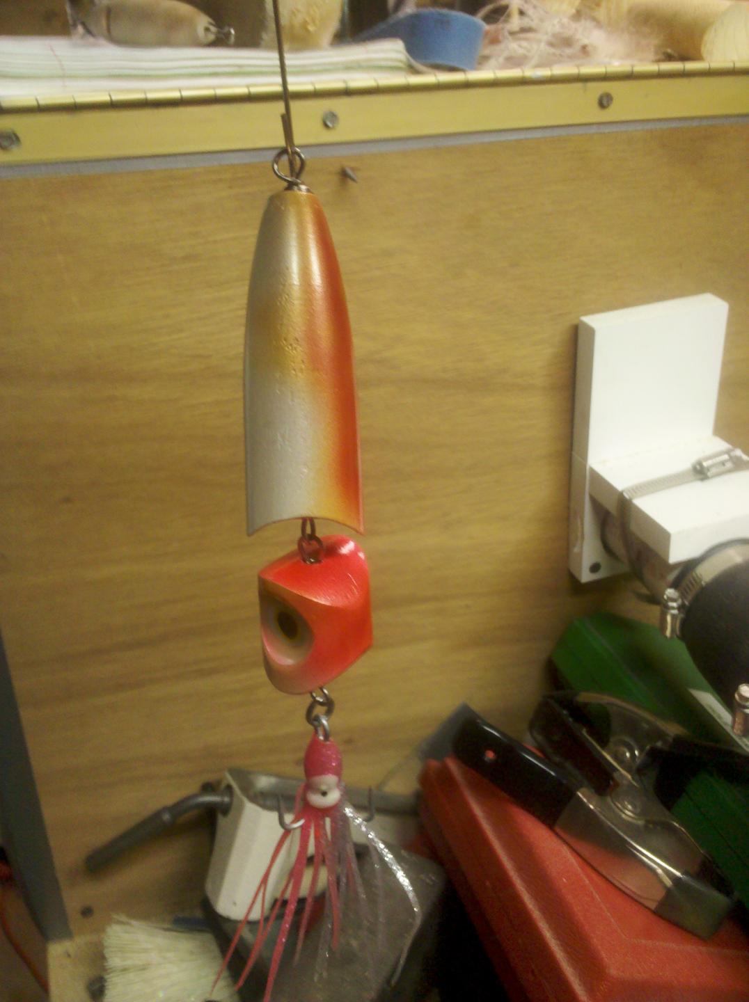 Johnny D will have to post how it swims, this is one of two experimental jointed squids I was playing with. I painted them with the plugfest plugs (should have Rattle canned them). I think I need to adjust the size. But as we know this is the fun part......