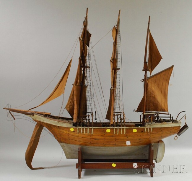 The model came from the estate of a George McQueston 1887-1975 who made his fortune importing quality wood to the shipbuilding and homebuilding (finish) industry. He was well to do as he got Mass license plate #4.... all during the post-depression time that Mayor/Governor Michael Curly pulled #5 for himself. If I had to guess, the model was made in the 1930s, possibly earlier, so no plastic, all lines go through working blocks, and all knots appear to be tied, not just glued. I was in his house in the 70s, so I know from all the high end wood trim in there that he wouldn't buy anything but the best. It might be worth some dough, or not.... Depending on an appraisal, I might turn it for a new kitchen, or maybe just a cabinet...