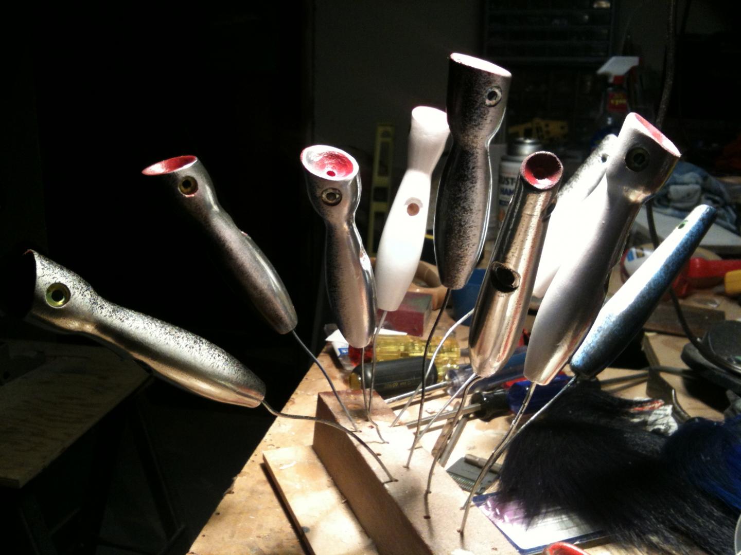 finished sanding 40 more plugs on friday night, just need to prime and theyll be ready for paint, and then put together a large order for weights, lips, swivels, wire, etc.